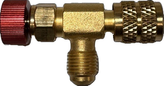 Neulaventtiilin avain jossa sulkuventtiili jolla estetään kylmäaineen vuotaminen liitettäessä täyttöletku laitokseen, letkuliitos on kokoa 5/16" ulkokierre ja liitososan koko on 5/16" sisäkierre. Kuva on viitteellinen