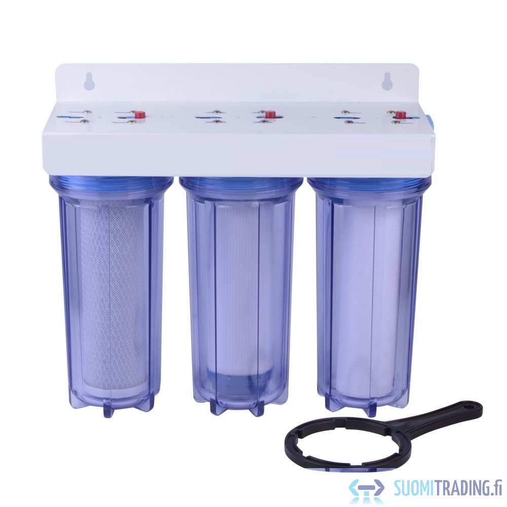 Sisältää: suodatinpatruunat, metallikiinnike seinäasennukseen sekä suodatinavaimen