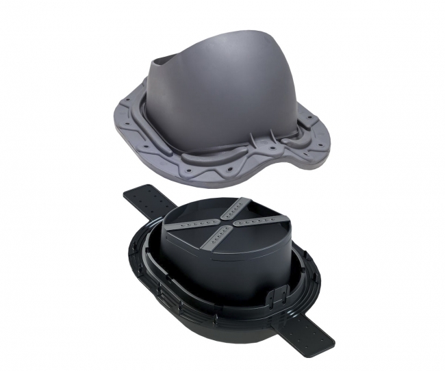 Sopii pyöreäharjaisille (tiilikuvioisille) muotokatteille, joiden tiilikuvion pituus on vähintään 350 mm. Läpivienti on muotoiltava, ja sen alapuolelle istutettu kumitiiviste varmistaa vedenpitävyyden. Käytetään VILPE P-sarjan Ø 75–160 mm tuuletus- ja poistoputkien sekä huippuimureiden kanssa. Sisältö: Läpivienti, aluskatetiiviste Click, ruuvit, sapluuna/asennusohje.