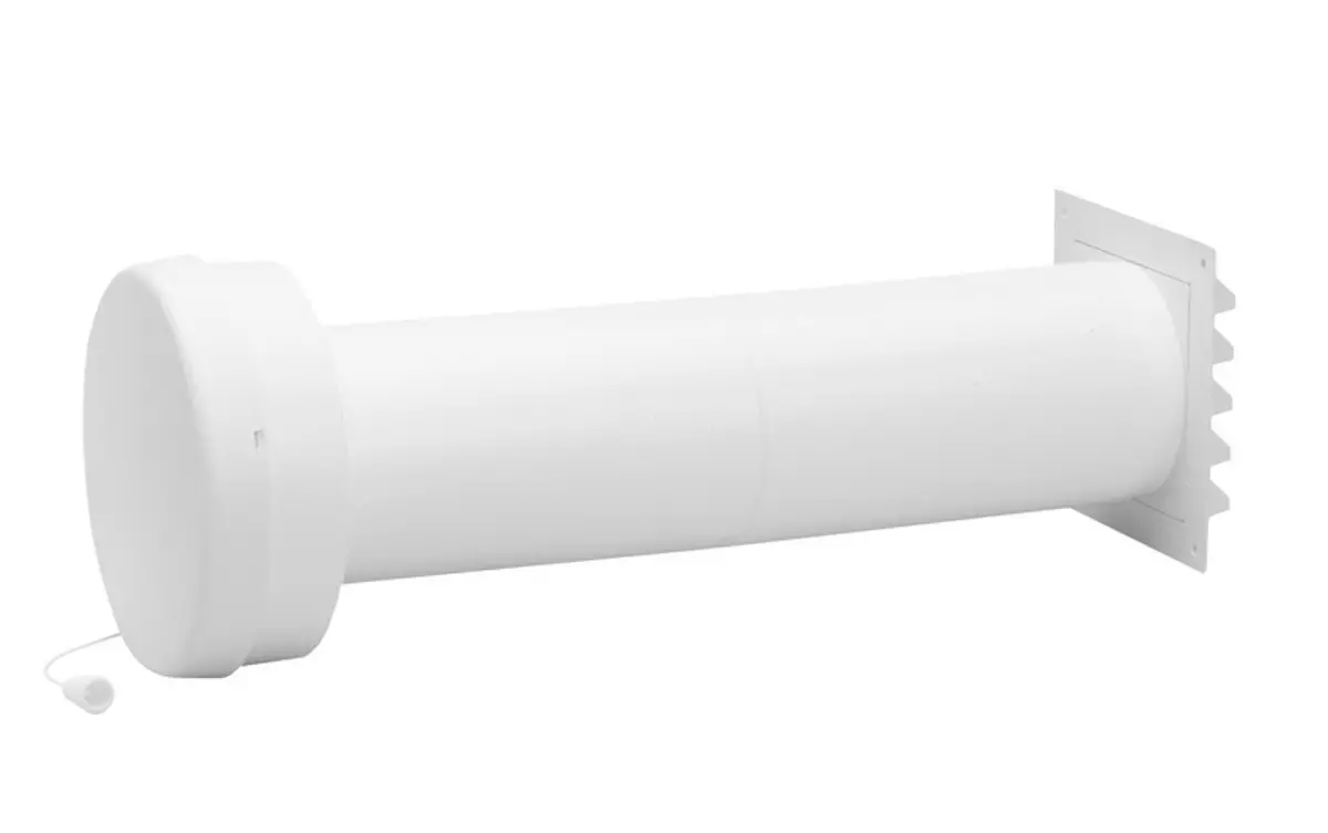 Valkoinen seinäventtiili F100 Ø 98/102. Seinäasenteinen, klassisen ilmeen omaava korvausilmaventtiili. Mukana vakiosuodatin ja kondensaatiosuoja. Venttiili avataan ja suljetaan vetonarulla. Minimi-ilmavirtaus säädettävissä.
