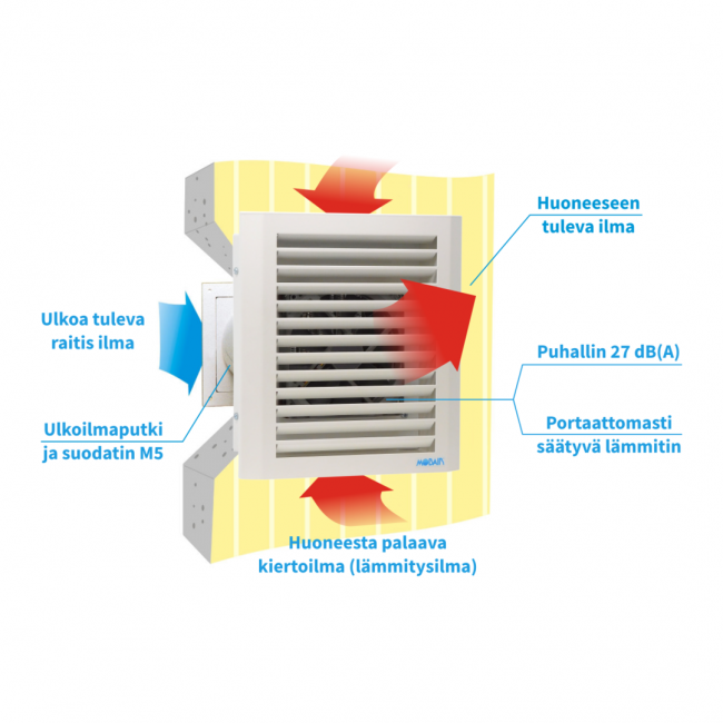 Kiertoilmapuhaltimella ja lämmittimellä varustettu Mobair 2015 tuloilmalaite soveltuu hyvin vanhoihin rakennuksiin, joissa on painovoimainen ilmanvaihto tai koneellinen poistoilmanvaihto. Mobair 2015 suodattaa ja lämmittää energiatehokkaasti huoneeseen virtaavan korvausilman.