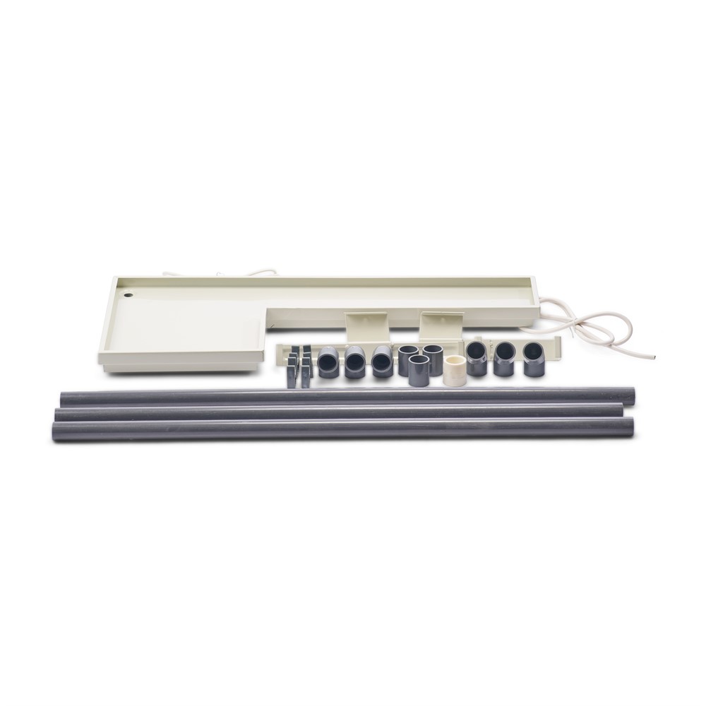 Asennuspaketissa on useampi kulma –sekä jatkoliitin, kiinnikkeet ja 3 x 1M putkea. Käytä PVC liimaa liitoksissa.