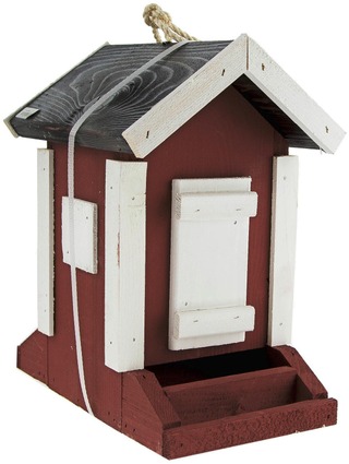 Puusta valmistettu lintulauta lintujen ruokintaan. Maalattu puna-valkoiseksi.