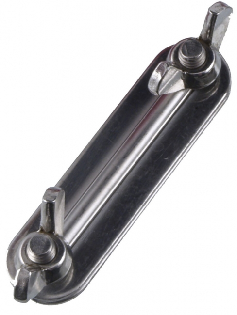 Ruostumaton nauhaliitin 40 mm aitanauhojen liittämiseen, jatkamiseen ja haaroittamiseen. Sopii myös kapeammille nauhoille.
