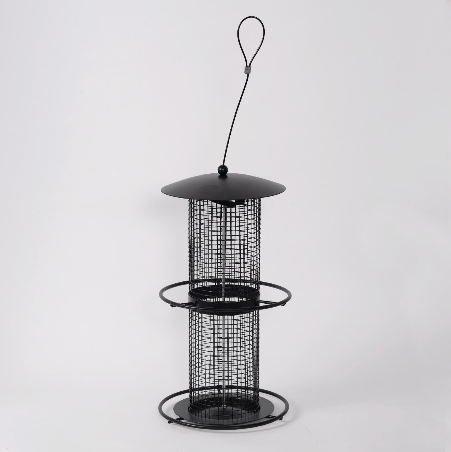 Perinteinen linnunruoka-automaatti pähkinöille. Mustaa metallia, 2 istuinrengasta. Mukana vaijeri ja karbiinihaka. Kork. 35cm Ø18cm.