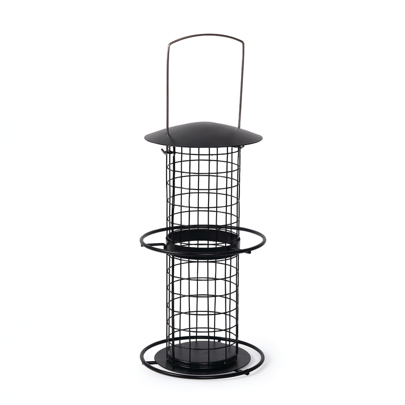 Perinteinen linnunruoka-automaatti suurille ja pienille talipalloille (480g ja 90g). Mustaa metallia, 2 istuinrengasta.