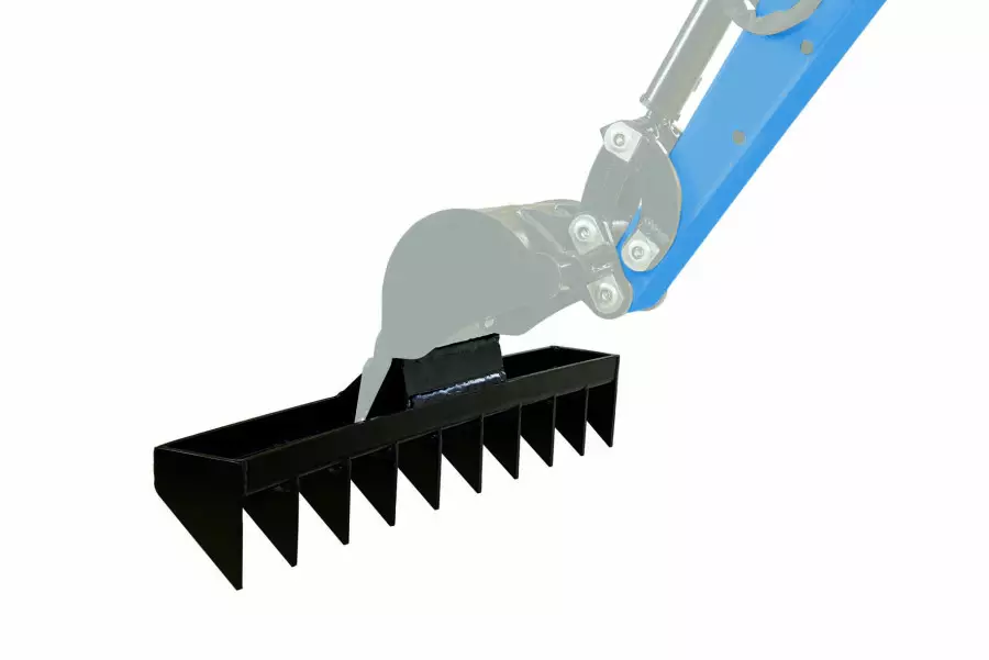 Kestävä kaivinkoneen harava – erittäin monipuolinen Täydellinen oljen tai rikkaruohojen haravointiin, kivien erotteluun, tasoitukseen ja maan kuohkeuttamiseen Suuri työleveys 100 cm, 10 piikkiä Helppo kiinnittää olemassa olevaan kauhaan Tukeva ja kestävä