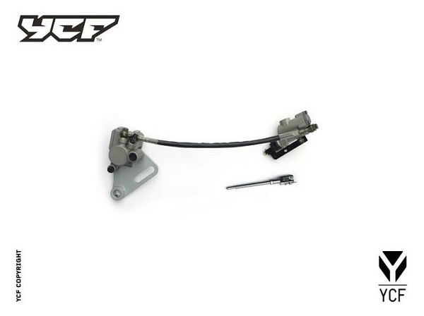 Käyttövalmis jarrupaketti jarrupaloineen, taka-akselin reikä 15mm, työsylinterin kiinnitysreikien väli 40mm, jarruputken pituus n. 370mm. Sopii ainakin YCF 125cc, 140cc ja 150cc malleihin, myös YCF 88 vm 2012 alkaen. Huom! 195-200mm jarrulevylle.