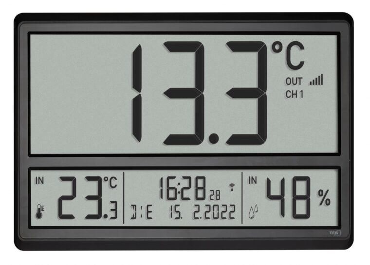 Nyt ei tarvitse tihrustaa. Tässä mittarissa on ison numeron korkeus 10 cm, joten sitä on helppo lukea kaukaakin. Voit valita näytetäänkö isoilla numeroilla ulkolämpötila vai kello. Mittari näyttää myös lämpötilan ja kosteuden sisällä. Radio-ohjatussa kellossa on hälytys torkkutoiminnolla. Ulkolämpötilalle on kolme kanavaa, joten voit halutessasi lisätä lähettimiä. Mittarin mukana toimitetaan yksi lähetin.