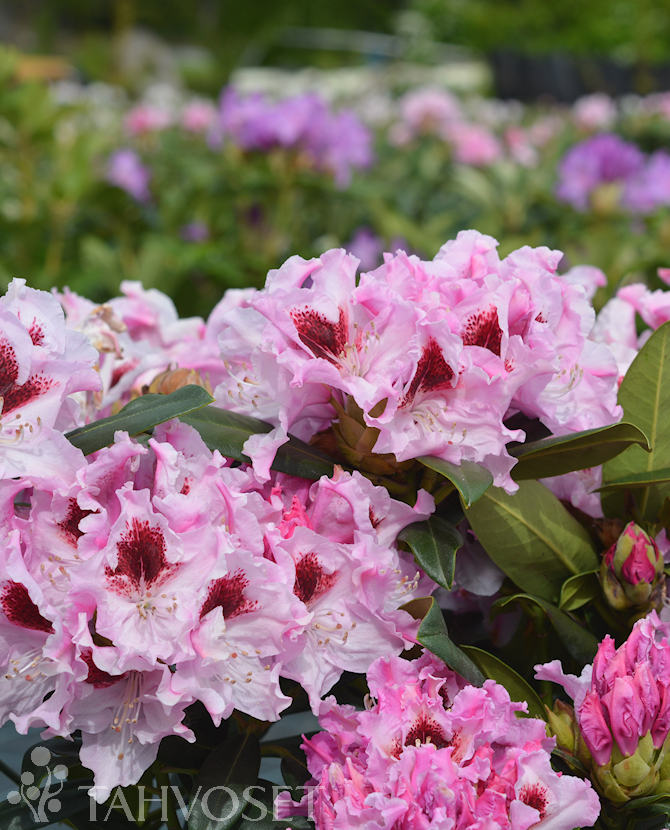 Hennon vaaleanpunaiset kukat, joissa tumma punaruskea laikutus. Terälehtien reunat aaltoilevat kauniisti.