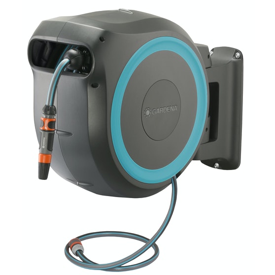 Tämä korkealaatuinen seinäletkukela sisältää kaiken tarvittavan: seinäteline, liitosletku, Orginal GARDENA System -liittimet, asennustarvikkeet sekä ruiskusuutin kahdella suihkumuodolla.