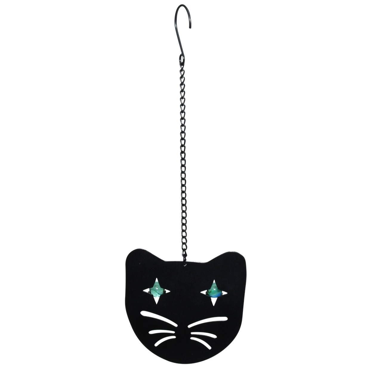 Kissan pään muotoinen linnunpelätin ripustimella, silmät marmorikuulat.