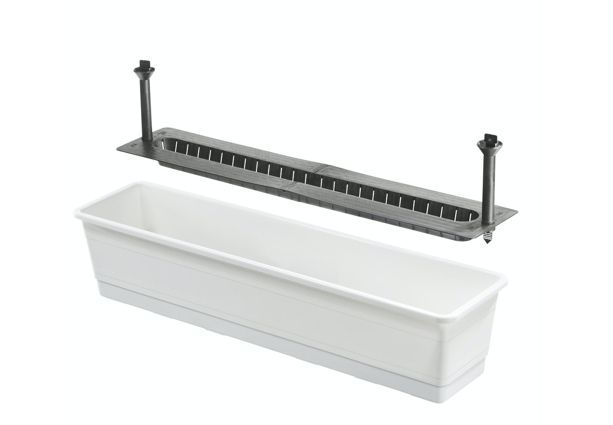 Tilava parvekelaatikko. Sisältää kasvien hoitoa helpottavan kestokastelujärjestelmän. Mittatikku kertoo kastelutarpeen – ei liikakastelun vaaraa. Ylivuotoaukot estävät liian sadeveden kertymisen laatikkoon. Mitat: 75 x 18 x 17 cm.