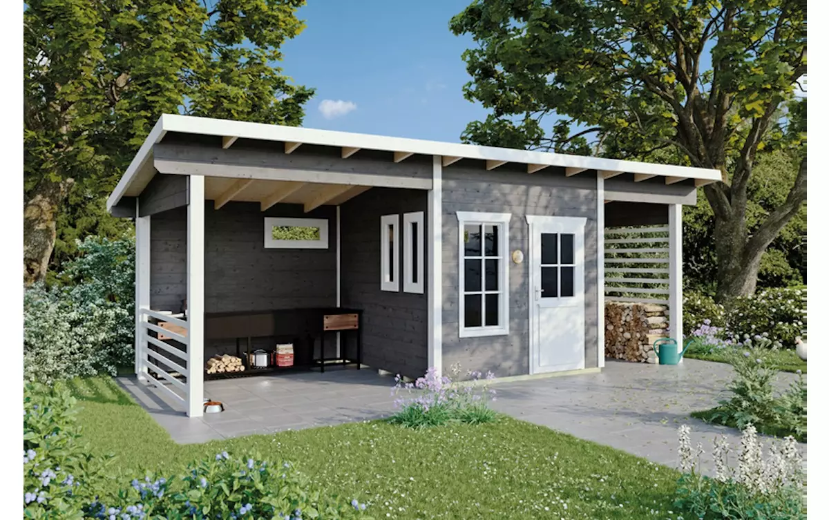 Monikäyttöinen, iso rakennus voi samanaikaisesti toimia erityyppisissä tarkoituksissa, toiseen päätyyn voi järjestää tavaroiden varastointipaikan ja toiseen tilat viihtymistä varten. Rakennuksen voi sijoittaa esimerkiksi siten, että toinen pääty on puutarhan oleskelualueiden ja toinen autopihan suuntaan. Isomman katoksen alle (2,7 x 2,5 m) mahtuu hyvin vaikka kesäkeittiö- ja ruokailutilat ja pienempi katos (1,6 x 2,5 m) voi toimia polttopuiden ja polkupyörien katoksena. Keskellä sijaitsevaan sisätilaan (2,6 x 2,5 m) mahtuvat kodin puutarhatyökalut ja muut tarvikkeet suojaan lukitun oven taakse tai siihen voi järjestää pienen verstaan tai vaikka nukkumapaikat usealle henkilölle.