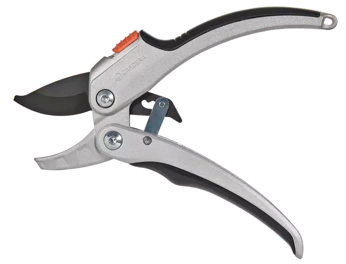 Puutarhasakset voi helposti lukita yhdellä kädellä turvallista säilytystä varten.