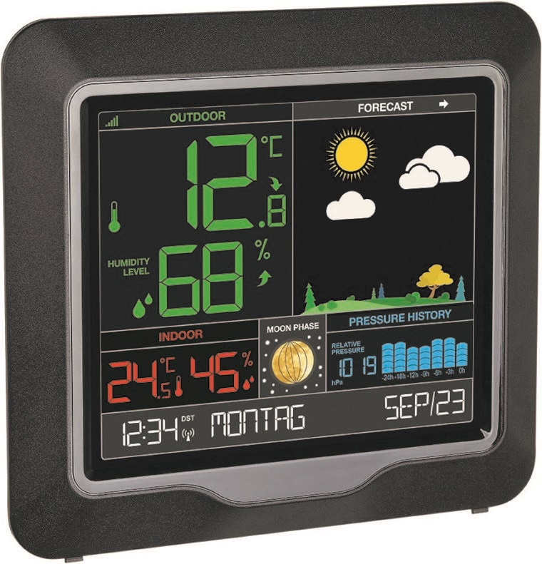 Ulkoilman lämpötila ja kosteus siirtyvät langattomasti näyttöyksikköön. Niiden lisäksi sääasema näyttää sisäilman lämpötilan ja kosteuden, sääennusteen, ilmanpaineen, kellonajan, viikonpäivän ja päivämäärän.