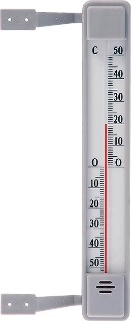 Ikkunanpuitteeseen kiinnitettävä ulkolämpömittari. Mittarissa on harmaa muovikehys ja valkoinen asteikkolevy mustalla painatuksella. Kiinnitetään nauloilla tai ruuveilla ikkunanpuitteeseen. Mittausalue on -50 - +50°C.