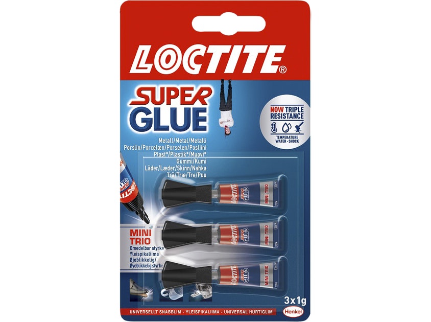 Loctiten monikäyttöinen ja luotettava Mini Trio-pikaliima on nopeasti kovettuva ja luja pikaliima. Se kuivuu läpinäkyväksi muutamassa sekunnissa ja muodostaa kestävän liitoksen. Uusittu koostumus kestää vettä ja konepesua, iskuja sekä jopa -50...+120 °C:n lämpötilat. Tuotteessa on tukkeutumista ehkäisevä korkki. Ei sisällä liuottimia. Käyttökohteet: Posliini, metalli, kumi, nahka, puu, muovi*, paperi. * Paitsi PE ja PP. Tuote ei sovellu lasin, Styroporin® (styroksi) tai keinokuitujen liimaamiseen.