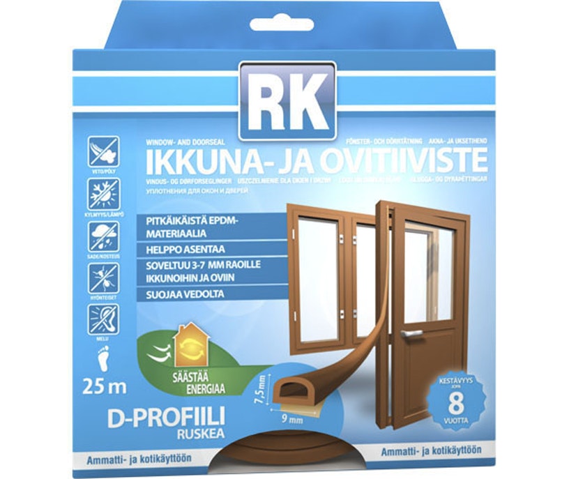 Korkealaatuinen, kestävä ja joustava EPDM-kumista valmistettu itseliimautuva tiiviste ovien ja ikkunoiden tiivistämiseen. Ruskea väri. D-profiili soveltuu 3-7 mm rakoihin. Profiilin leveys 9 mm. Pakkauksessa on 25 metriä tiivistettä.