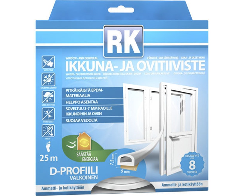 Korkealaatuinen, kestävä ja joustava EPDM-kumista valmistettu itseliimautuva tiiviste ovien ja ikkunoiden tiivistämiseen. Valkoinen väri. D-profiili soveltuu 3-7 mm rakoihin. Profiilin leveys 9 mm. Pakkauksessa on 25 metriä tiivistettä.