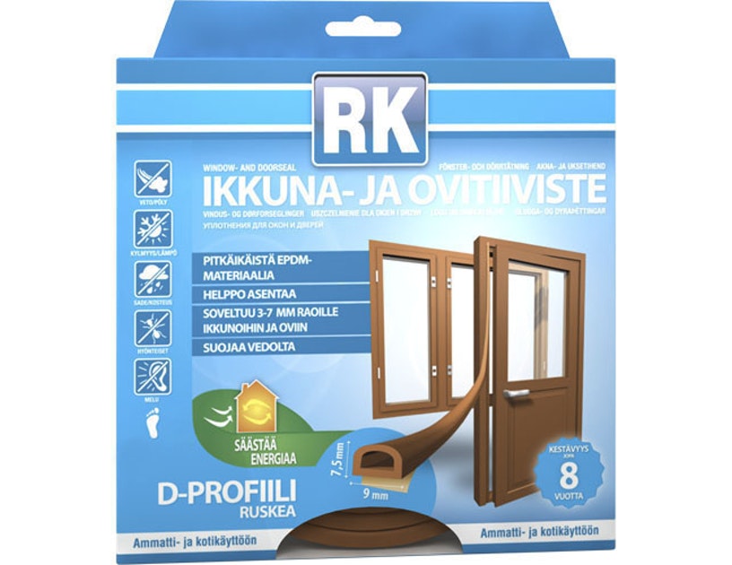 Korkealaatuinen, kestävä ja joustava EPDM-kumista valmistettu itseliimautuva tiiviste ovien ja ikkunoiden tiivistämiseen. Ruskea väri. Pakkauksessa on 6 metriä tiivistettä.