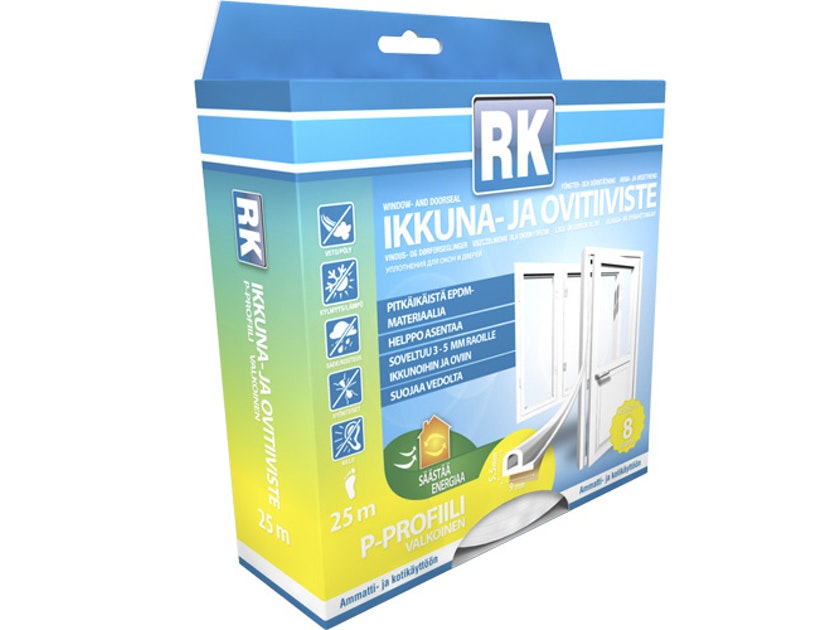 Korkealaatuinen, kestävä ja joustava EPDM-kumista valmistettu itseliimautuva tiiviste ovien ja ikkunoiden tiivistämiseen. Valkoinen väri. P-profiili soveltuu 3-5 mm rakoihin. Profiilin leveys 9 mm. Pakkauksessa on 25 metriä tiivistettä.
