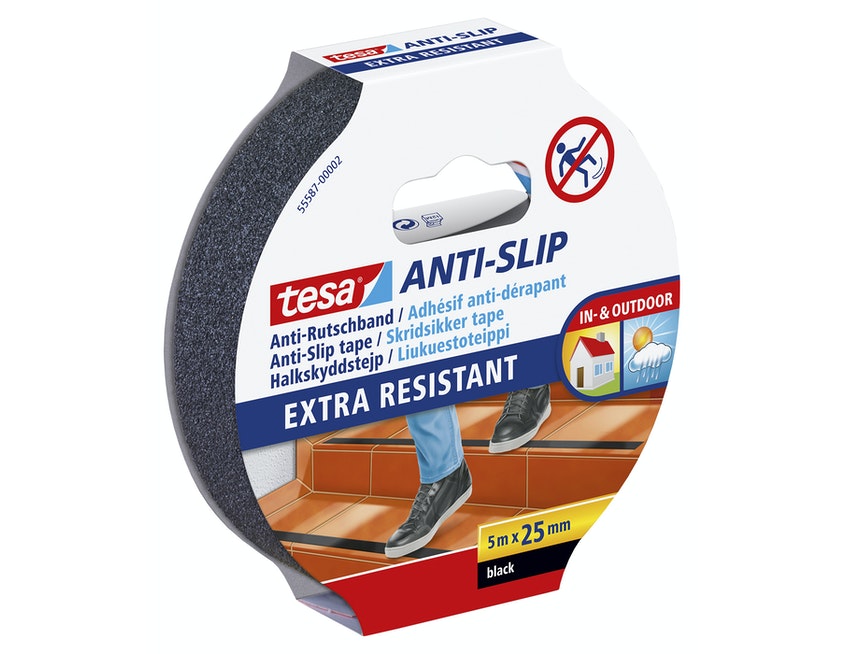 Tesa® Anti-slip-liukuesteteippi estää tehokkaasti liukastumiset vaarallisilla alueilla, kuten portaissa, rampeissa, liukkailla lattioilla ja veneiden kansilla.