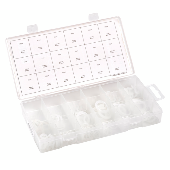 Kätevä lajitelmalaatikko jossa 18 erilaista, yhteensä 225 kpl silikoni O-renkaita moneen eri tarpeeseen.