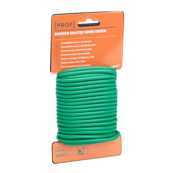 Vihreä kumipäällysteinen rautalanka, jonka paksuus on 5 millimetriä ja pituus 10 metriä.