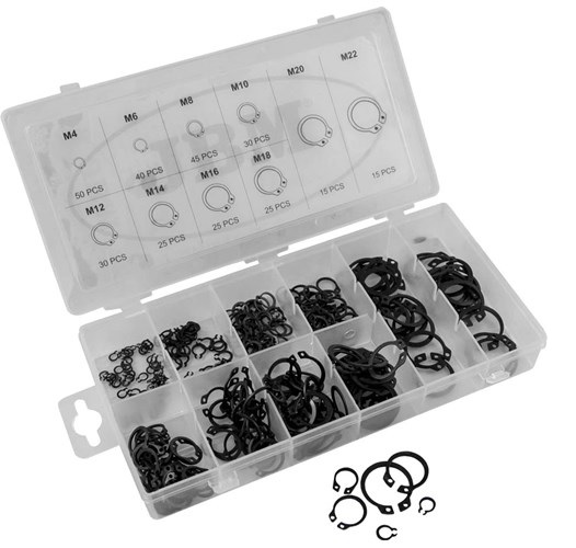 300 osainen ulkopuolinen lukkorengaslajitelma ø4-22mm. 50kpl ø4mm, 40kpl ø6mm, 45kpl ø8mm, 30kpl ø10mm, 30kpl ø12mm, 25kpl ø14mm, 25kpl ø16mm, 25kpl ø18mm, 15kpl ø20mm ja 15kpl ø22mm.