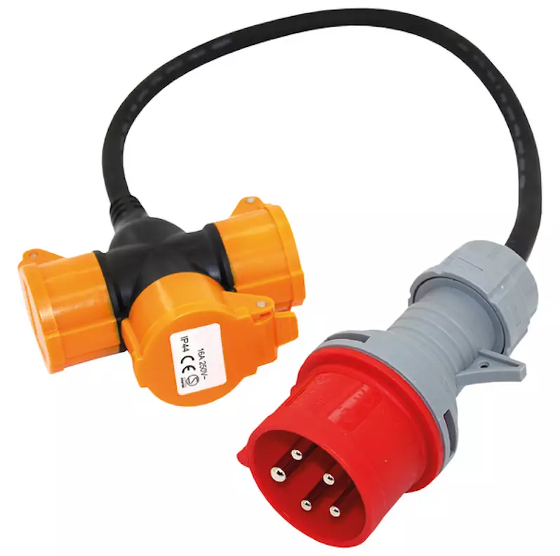 OPALin voimavirta-adapteri on yhden metrin pituinen. H07RN-F3G2.5. 3 pistoketta. Suojaus IP44. 16 A.