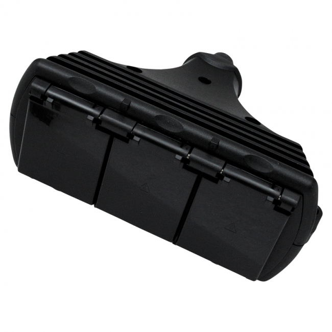 Maadoitettu 3-osainen jatkopistorasia. RVT. Musta. 16 A/250 V. Suojausluokka IP44.