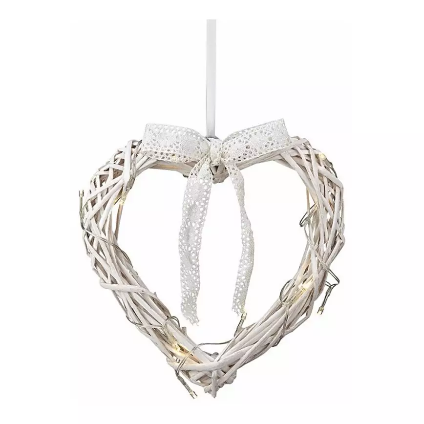 Sydämenmuotoinen jouluinen rottinkikoriste. Taustavalaistu 15 LEDiä. Virtalähde 3x 1,5V AA-paristo (ei sisälly). Kaapeli 50cm. Säädettävä ajastin. Tuotemerkki: