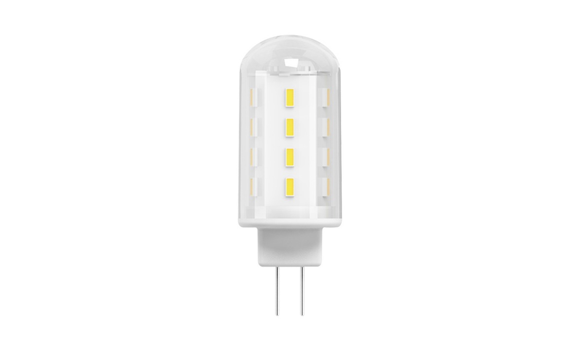 Led-polttimo 12 V. Teho 2,2 W, G4-kanta, 200 lm, värilämpötila kirkas valkoinen 4000 K. Halkaisija 16 mm, pituus 45 mm.
