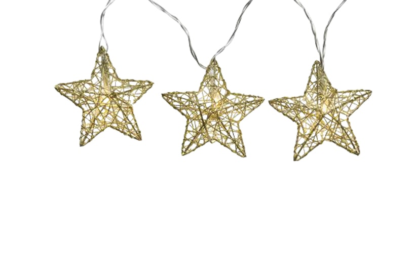 Paristokäyttöinen led-valosarja, jossa kullanvärisiä tähtiä.Tarkoitettu sisäkäyttöön. Ei sisällä paristoja (3 x AA).