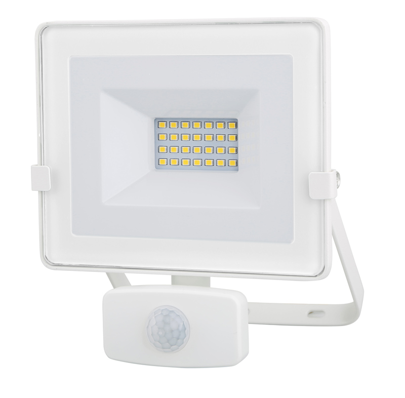 PIR-liiketunnistimella varustettu 20 W led-valonheitin valaistukseen sisällä ja ulkona. Valoteho 1600 lm. Valkoinen runko alumiinia. Paloajan-, tunnistusherkkyyden- ja valoherkkyyden säätö. Myös PIR-tunnistimen asento säädettävissä.