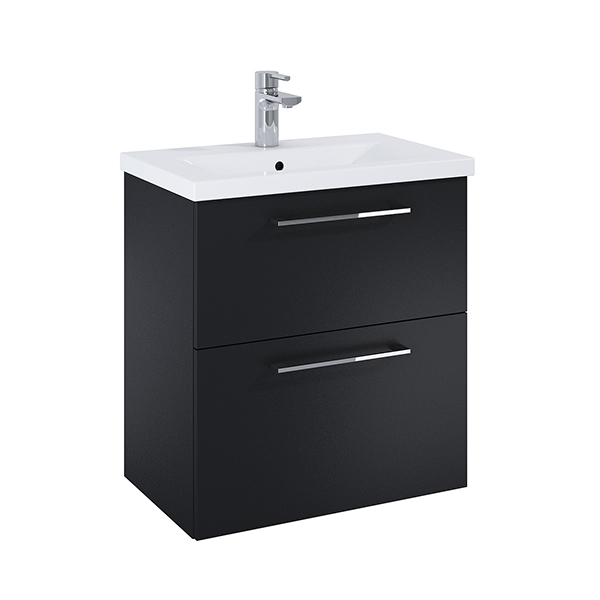 Kalla-allaskaappi sisältää allaskaapin, posliinialtaan ja kromiset vetimet. Allaskaappi on mattamusta ja sisus antrasiitti. Laatikoissa on soft-close-saranat. Mitat 617 x 397 x 672 mm