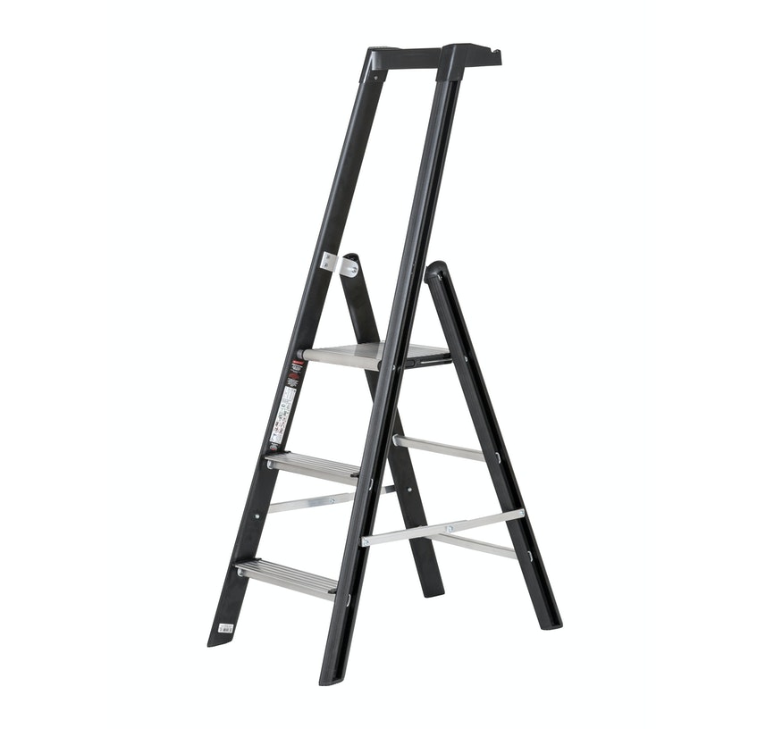 Sivuprofiilien muotoilu ja musta struktuurimaalipinta tekevät tikkaasta miellyttävän käyttää. Uudistettu työkalukotelo, korkeampi polvituki, suuri alumiininen seisontataso 300 x 250 mm, metallirajoittimet ja luja askelmakiinnitystekniikka tuovat turvallisuutta työskentelyyn.