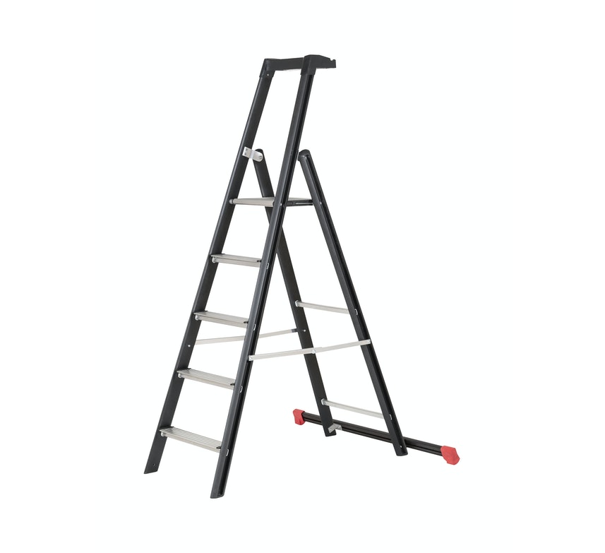 Sivuprofiilien muotoilu ja musta struktuurimaalipinta tekevät tikkaasta miellyttävän käyttää. Uudistettu työkalukotelo, korkeampi polvituki, suuri alumiininen seisontataso 300 x 250 mm, metallirajoittimet, vaakatuki 1,1 m ja luja askelmakiinnitystekniikka tuovat turvallisuutta työskentelyyn.