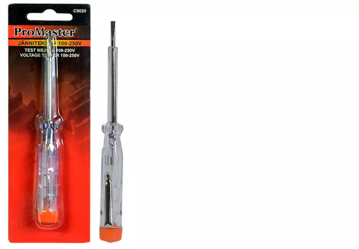ProMaster -vaihtojännitteiden 100-250 VAC testaamiseen -merkkilampulla -talttakärjellä -CE-merkitty -IP-ripustinpakkaus -takuu 1 vuosi