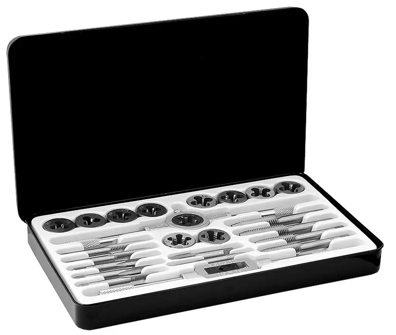 -24-osainen sarja sisältää --10 mm tapit ja pakat M5x0.8, M5x0.9, M6x0.75, M6x1.0, M8x1.0, M8x1.25, M10x1.25, M10x1.5, M12x1.5, M12x1.75, 1/8NPT27 --1 kpl kierrepakan väännin, halkaisija 25 mm --1 kpl kierretapin väännin M3-M12 -metallinen säilytyslaatikko -värillinen pahvipakkaus