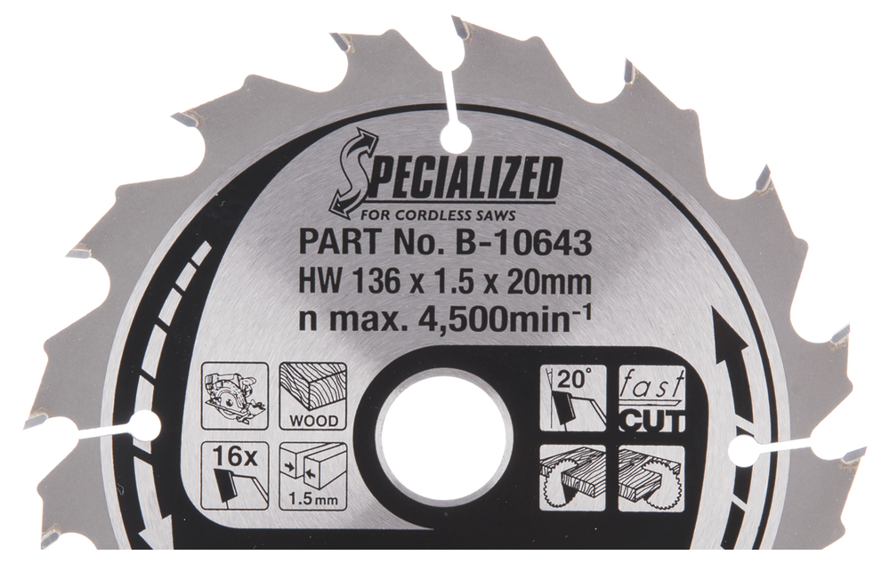 Specialized pyörösahanterä 136mm halkaisijalla ja Z-16 hammastuksella nopeaan puun sahaamiseen. Terä jättää karkean sahausjäljen ja soveltuu akkukäyttöisillä käsipyörösahoilla käytettäväksi. Terän hampaan leveys 1,5mm ja reiän halkaisija 20mm.