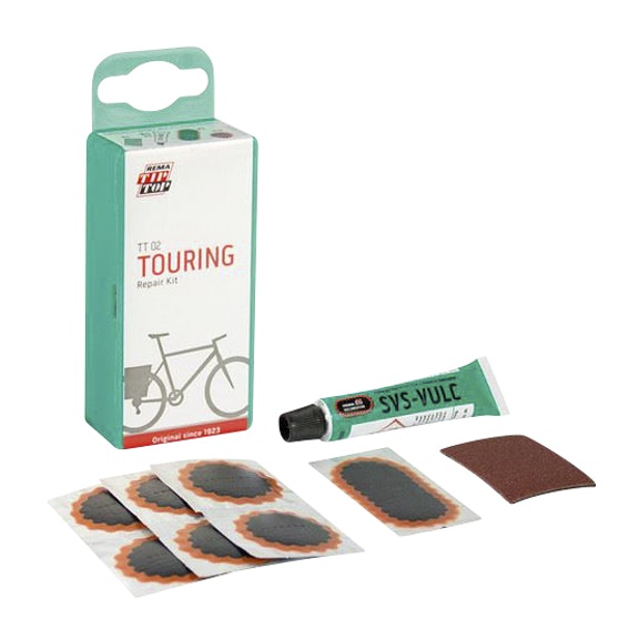 Tip-Top-paikkarasia pyörien ja mopojen sisärenkaiden paikkaukseen. Sarja sisältää seitsemän paikkaa: kuusi halkaisijaltaan 25 mm:n pyöreää paikkaa ja yksi 45 x 20 mm:n ovaali paikka.