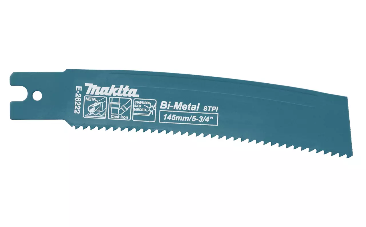 E-26222. Kaareva terä metallin, valuraudan ja RST:n katkaisuun. 5 kpl pakkaus. Poikkeavan kiinnityksen vuoksi sopii erityisesti Makitan ketjulisälaitteella varustettuun putkipuukkosahaan.